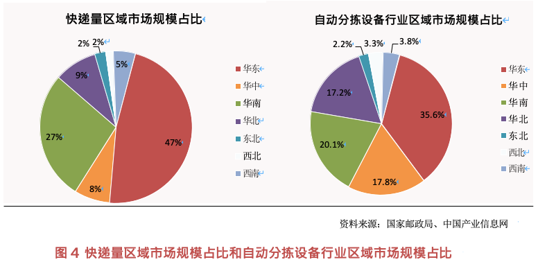 我國自動分揀設備市場區域分布情況與電商快遞數量分布情況高度正相關,以江浙滬為代表的華東區域及以廣東為代表的華南區域市場份額巨大,自動分揀設備市場規模更大、技術發展更快,其中華東地區以超過 35%的市場份額位穩居首位,區域市場規模效應明顯。