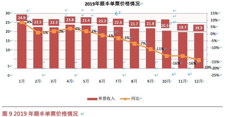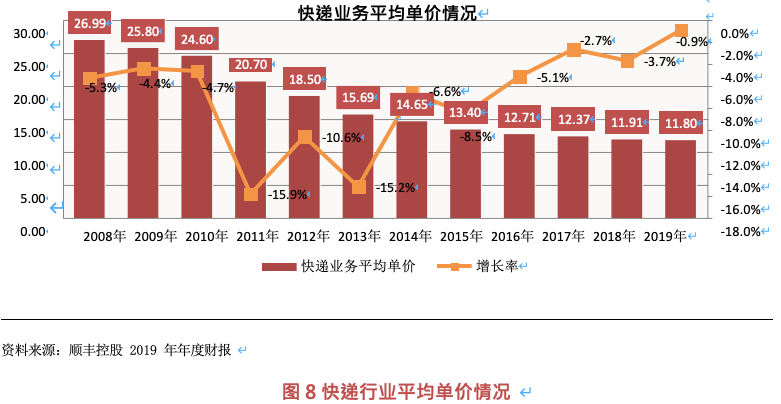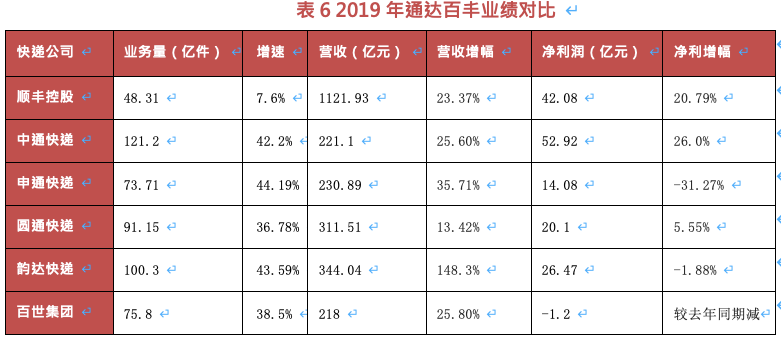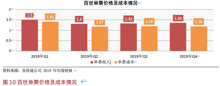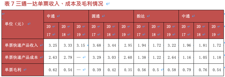 從快遞單票價格情況來看,順豐控股票均單價從 2018 年的 23.2 元降到 2019 年的 21.8 元, 降幅 6%。三通一達方面,申通、圓通、中通價格均實現下降,韻達同比增長,但利潤方面保存平穩。百世快遞同時受中低端快遞市場價格戰加劇影響,百世快遞單票收入由 1.53 元下滑至1.35 元,同比下降 11.76%,為通達系最低水平。單票毛利 0.17 元,毛利率 6.01%,同比增加0.66 個百分點。