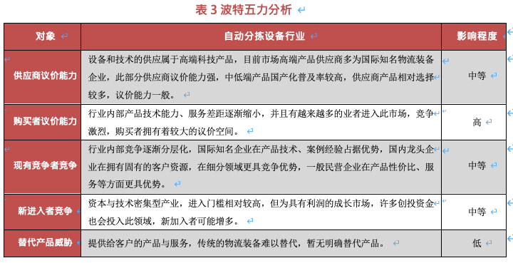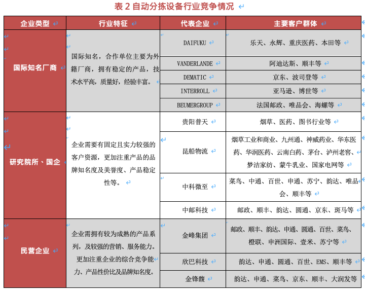 自動分揀設備行業內龍頭企業擁有豐富的成功經驗,龍頭企業經營特征體現在三個方面:一是緊緊抓住下游高利潤細分行業或企業;二是擁有核心技術,制定行業標準;三是擁有豐 富的集成經驗,積極拓展上下游領域市場。