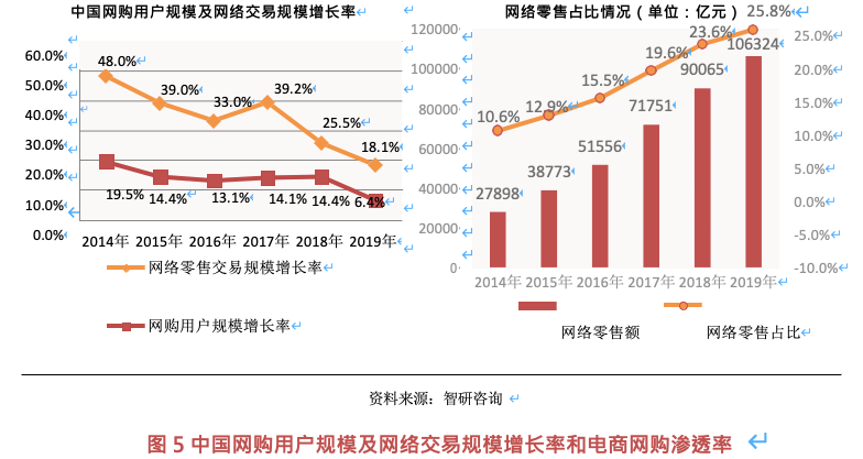 我國快遞與電商行業自 2012 年以來,每年增速在 30%以上,但是隨著電商規模基數的不斷增長,其增長率逐漸放緩。據推測,未來 3 年快遞行業的增速將維持在 15%-20%的中高速增長區間內,2019 年我國網購用戶規模達到 6.49 億人,同比增長 6.4%,較 2018 年增長率降低 8 個百分點;網絡零售交易規模達到了 10.63 萬億元,同比增長 18.1%,增長率較 2018年下降 7.4 個百分點。從電商網購滲透率來看,當前實物商品網上交易額占社會零售總額的比重仍在不斷上升,2019 年達到了 25.8%,較 2018 年上升 2.2 個百分點,但增速呈放緩態勢。