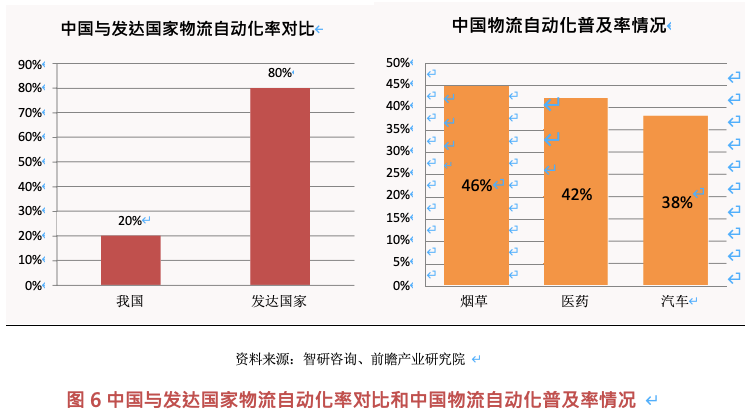 自動分揀設備應用的主要領域除電商快遞業外,還包括煙草、醫藥、汽車、服裝、食品、家居等制造行業。這些領域的輸送分揀設備市場需求量仍然占據總需求的大部分比例,對輸送分揀設備需求增長比較穩定。我國物流自動化行業起步較晚,目前整體物流自動化普及率在 20%左右,對比發達國家 80%水平尚有巨大的可開發空間。細分行業中,煙草、醫藥、汽車自動化率分別為 46%、42%和 38%,處于國內領先水平,基于中國巨大的制造業體量,自動分揀設備的長期增長驅動力必然在制造業內得到體現。